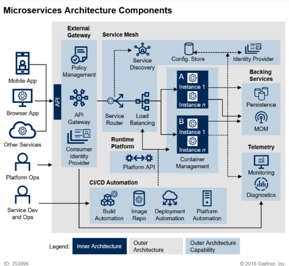 가트너MSAComponent.png MicroService Architecture는 크게 Inner Architecture와 Outer Architecture로 구분할 수 있습니다. 위 그림에서 남색 부분은 Inner Architecture의 영역이고, 회색 부분은