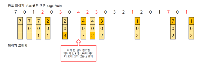 사용 빈도가 가장 적은 페이지를 교체합니다. 최적 알고리즘과 비슷하게 동작하지만, 사용 횟수를 기록하고 있어야 하기 때문에 메모리 사용량이 많습니다.