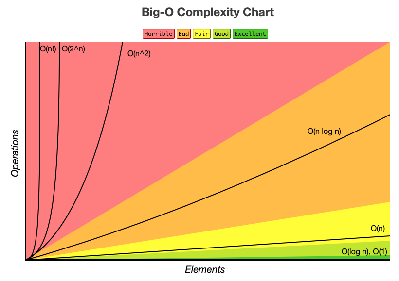 알고리즘 성능을 수학적으로 표기해주는 표기법이다. 알고리즘의 실행시간보다는 데이터나 사용자 증가률에 따른 알고리즘 성능을 예측하는게 목표이므로 중요하지 않은 부분인 상수와 같은 숫자는 모두 제거한다.